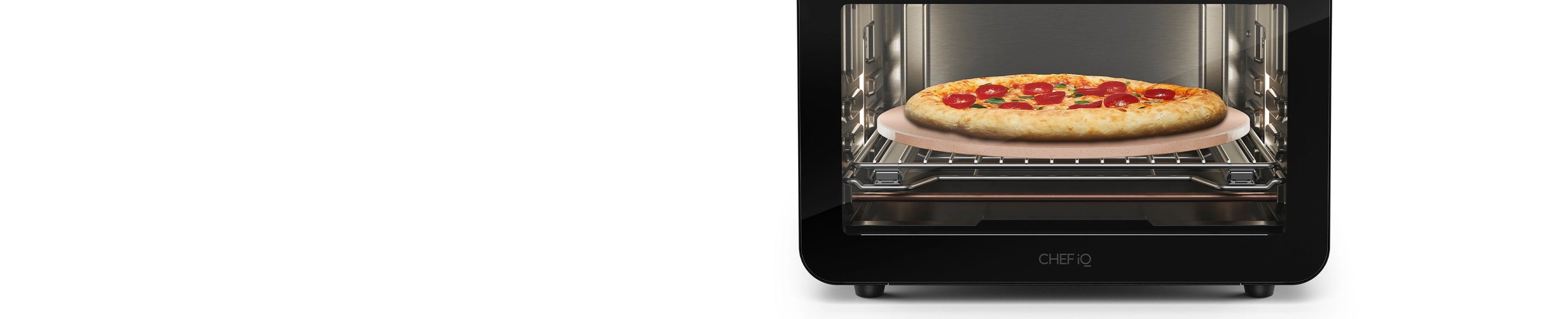 iQ MiniOven's 25-quart interior fits a 13" pizza or a 9" x 13" baking tray while remaining sleek and compact.