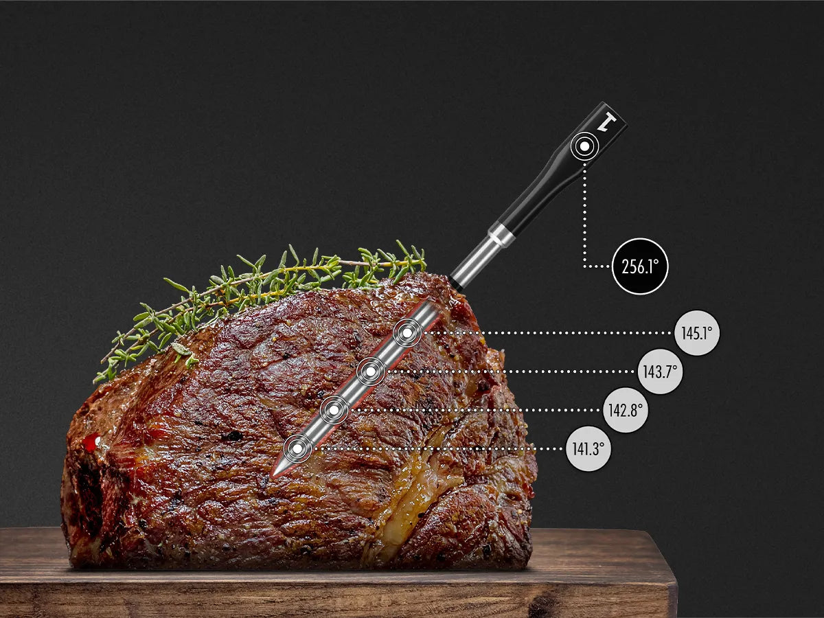 Grill to perfection with the iQ Sense Smart Wireless Meat Thermometer. Get real-time internal temperature updates, flip reminders, and rest timers, along with estimated cooking times and guided cooking recipes. Featuring 5 sensors for maximum accuracy and heat-resistant up to 1000°F, this thermometer allows for unlimited wireless range via Wi-Fi through the Smart Hub.